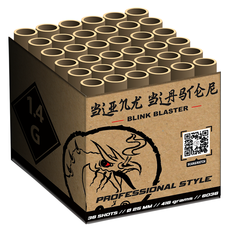 Flitsende boeketten met felle zilverblink gecombineerd met kleuren zoals rood, groen, en geel, gevolgd door dikke peony met heftige crackling. n nProductinformatie: nType product: Siervuurwerk nEffect product: Cake nTube diameter: 25mm nFanshape: Nee nClassificatie: CAT.F2 nMinimale leeftijd: 16 jaar nLegaal afsteken op: 31 december nVeiligheidsafstand: minimaal 8 meter nGeschikt voor smalle straten: Ja nGeschikt in Gemeente vuurwerkverbod: Nee Blink Blaster 36 shots 25mm Goedkoop vuurwerk kopen bij Vuurwerkwinkel Doetinchem