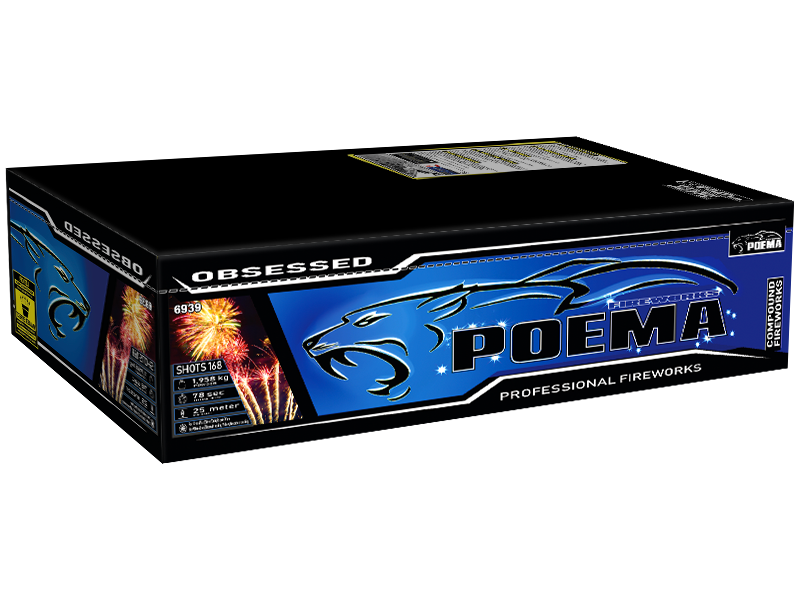Obsessed nDe Obsessed is een mooie V-shape compound cake uit de nieuwe Poema serie met 168 shots! n nKruitgewicht 1658 Gram nTube diameter 25 / 30 nBrandtijd 78 Seconden nHoogte 30 m. – 35 m. Obsessed Goedkoop vuurwerk kopen bij Vuurwerkwinkel Doetinchem